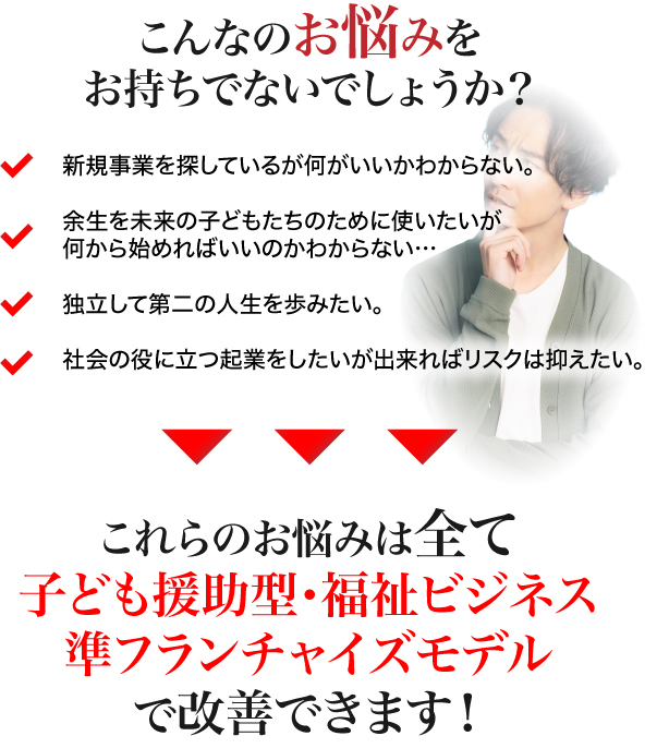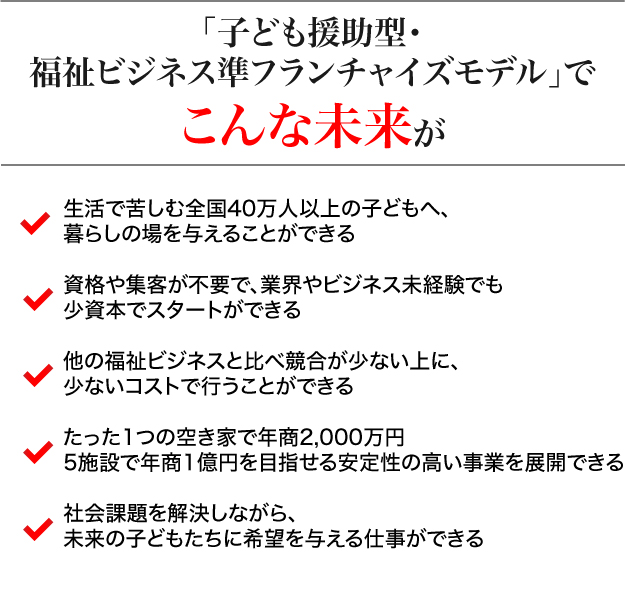 「子ども援助型・福祉ビジネス」は地域やニーズに合わせて適応できる特長があります。これにより、事業をスケールアップし、地域などにとらわれない自由な事業成長をすることができます。